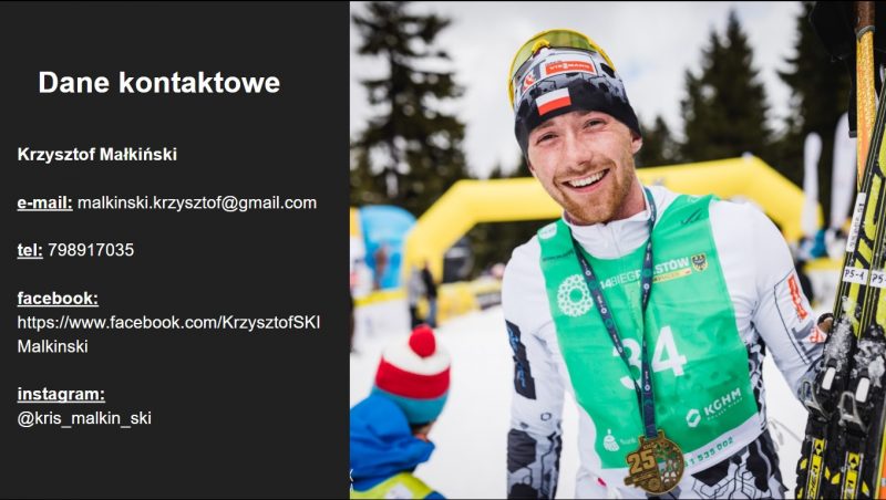 Od ponad 15 lat jestem związany ze sportem, głownie z biegami narciarskimi. Jestem studentem AWF Katowice, czynnym zawodnikiem, pracuję jako instruktor/trener w Fischer Jakuszyce. Jako wieloletni zawodnik zdobyłem doświadczenie pozwalające mi opracowywać rozwiązania, metody i sposoby treningowe, które dzięki systematycznej i ciężkiej pracy prowadzą do sukcesu. Do osiągnięć zaliczam: medale mistrzostw Polski, zwycięzca rankingu Pucharu Polski 2018/2019 i 2019/2020, medalista Pucharu Kontynentalnego, zwycięzca maratonów narciarskich na różnych dystansach i wiele innych sukcesów. Współpracuję zarówno z młodymi, początkującymi biegaczami jak i zaawansowanymi zawodnikami.